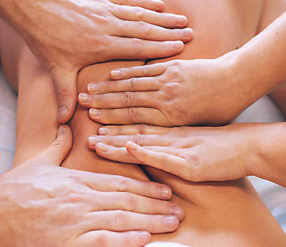 Kod masaže sa četiri ruke naša dva terapeuta zajedno rade na jednom klijentu, često koristeći sinkronizirane pokrete. Masaža sa četiri ruke je kao da doživljavate dvije masaže cijelog tijela u isto vrijeme. Profesionalni masažni terapeuti koriste tijelo klijenta kao slikarsko platno na kojem slikaju, detaljnim pokretima, različitog tempa i pritisaka. Postoji nekoliko različitih stilova masaže sa četiri ruke. U početku ćete se možda uhvatiti kako pokušavate pratiti terapeute, međutim, vrlo brzo vaš mozak će shvati da nije siguran tko što radi i odustaje od kontrole. Ovo je moćan tretman za sve koji se teško opuštaju tijekom tretmana.